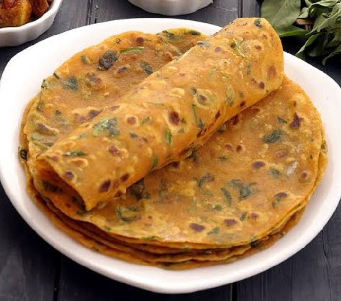 It is typically enjoyed as a breakfast , or can be eaten for snacks. It can also be served as a side dish with a meal, or as a snack in the late afternoon. Thepla can be made with wheat flour, besan (gram flour), methi (fenugreek leaves) and other spices. Thepla can be enjoyed together with dahi (yogurt), red garlic chutney and chhundo (sweet mango pickle).